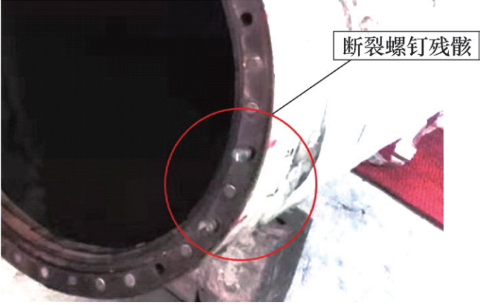 30CrMnSiNi2A是廣泛應用于我國航空航天制造的低合金超高強度鋼,是一種綜合性能優良的結構材料。該鋼在30CrMnSiA鋼的基礎上提高了錳和鉻含量,并添加了1.4%~1.8%的鎳(質量分數),使其淬透性得到明顯提高[1]。經過熱處理后可獲得高的強度、塑性和韌性,良好的抗疲勞性和斷裂韌度,低的裂紋擴展速率,因而適合制造高強度的連接件、軸類零件以及起落架等重要受力結構件。但30CrMnSiNi2A鋼等溫熱處理制度較為嚴苛,不合理的熱處理制度無法發揮材料性能,在使用過程中容易發生脆性斷裂。某型號固體火箭發動機燃燒室殼體尾端采用法蘭連接結構連接后封頭,該燃燒室殼體進行水壓爆破試驗時,升壓至16MPa時(設計要求爆破壓力≥17.4MPa),首個螺釘從第一扣螺紋處發生斷裂,繼續升壓至16.6MPa時,所有螺釘斷裂,燃燒室殼體后封頭脫落,連接失效(見圖1)。