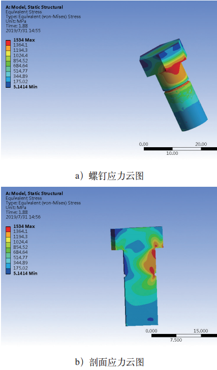 對法蘭連接結構進行仿真驗證,建立模型對法蘭連接結構進行分析和計算,計算出螺釘在16MPa內壓載荷下螺釘受力情況。由應力云圖(見圖2)可以看出,螺釘最大等效應力為1534MPa,出現位置為第一扣螺紋底部,在塑性應變云圖(見圖3)中,最大塑性應變為6.6%,綜合以上兩個結果,螺釘在承力時,第一扣應力最大,但是應力主要集中在螺釘表面,螺釘心部應力較小,為發生塑性應變。
