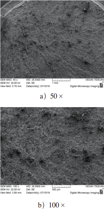 螺釘斷裂位于第一扣螺紋處。螺釘斷裂宏觀特性觀察:斷口呈暗灰色,斷口平齊,斷面可見放射性棱線,棱線聚集的一端為裂紋的起點處,斷口附近無明顯塑性變形(見圖5)。