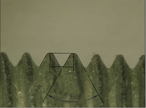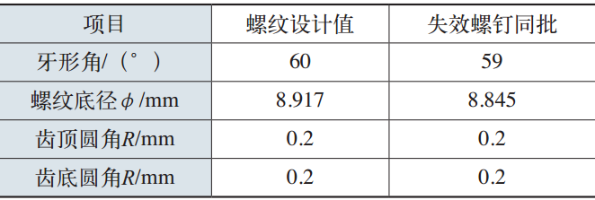 采用顯微鏡對失效螺釘同批產品螺紋進行了放大,并進行了測繪,計算了螺釘的牙形角和螺紋底徑,結果見表4。