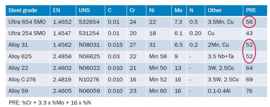根據(jù)下表合金的抗點(diǎn)蝕當(dāng)量-PRE值,Ultra 654SMO的耐腐蝕性能是要優(yōu)于Alloy 31和Alloy 625。