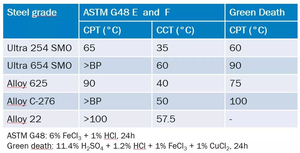 通過ASTM G48的測(cè)試,Ultra 654SMO的臨界點(diǎn)腐蝕溫度(CPT)和縫隙腐蝕溫度(CCT),跟鎳基合金Alloy C276和Alloy 22相當(dāng)。