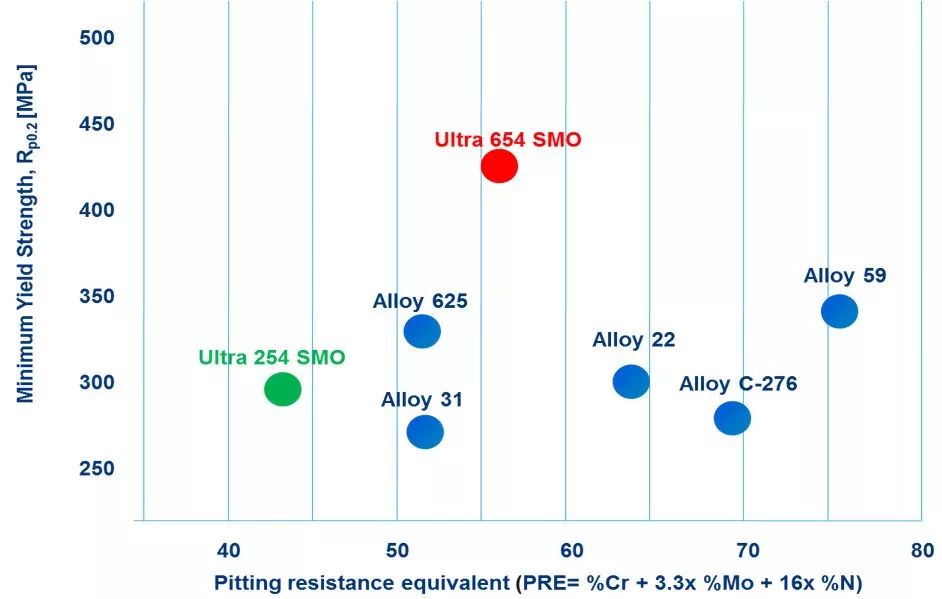 Ultra 654SMO的屈服強(qiáng)度Rp0.2≥430MPa,遠(yuǎn)高于傳統(tǒng)的鎳基合金。