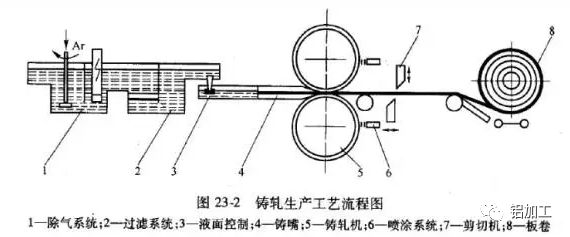 鑄軋工藝流程:液態(tài)金屬、前箱(液面控制)、鑄軋機(潤滑系統(tǒng)、冷卻水)、剪切機、卷取機。