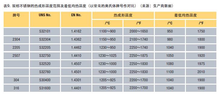 大多數(shù)加工者建議最大熱成形溫度范圍在1100~1150℃之間。之所以建議溫度上限,是由于高溫對工件尺寸穩(wěn)定性的影響以及氧化皮隨著溫度升高而增多的趨勢。在高溫下,雙相不銹鋼會變軟,被加工的工件如容器封頭或管道如果在爐內不加以支撐就會彎曲或凹陷。在這些溫度鋼也會由于某種熱成形操作變得太軟。表9匯集了幾種雙相不銹鋼的熱成形溫度范圍和最低均熱溫度。不一定要從該范圍內的最高溫度開始熱加工。但是,鋼在熱加工前至少要達到最低均熱溫度,爐子應當預熱,以避免經(jīng)過σ相形成溫度區(qū)間的緩慢加熱。