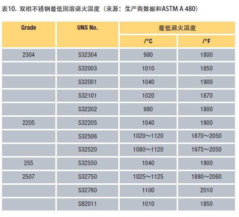 熱成形之后,需要進行完全的固溶退火,然后快速淬火使力學性能和耐腐蝕性能完全恢復。工件應當加熱到最低固溶退火溫度以上,然后保持足夠長的時間使金屬間相完全溶解。一個謹慎的原則是,保溫時間應當與工件完全退火后在650~980℃ 范圍停留的時間相當。工件應當從固溶處理溫度開時水淬。當最后的退火之后向淬火地點轉移時,不允許在700~1000℃的溫度范圍停留幾分鐘。表10總結了雙相不銹鋼的最低固溶處理溫度。