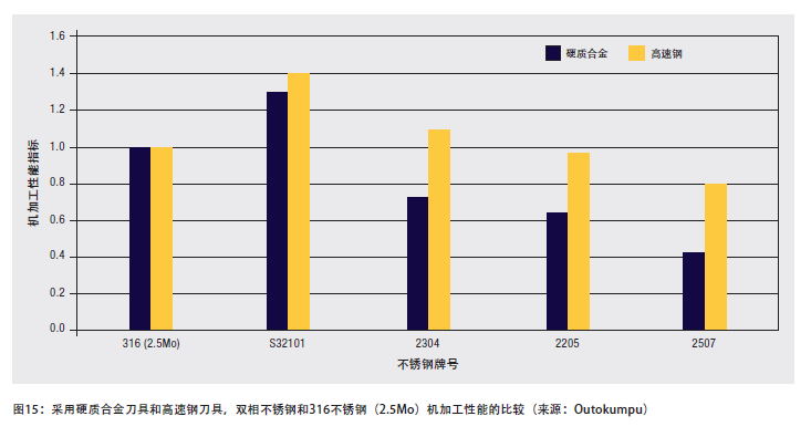 由于這些原因,雙相不銹鋼比具有同樣耐腐蝕性的300系列奧氏體不銹鋼更難進行機加工,雙相不銹鋼的機加工一般要求更大的切割力,并且刀具的磨損更快。當采用硬質合金刀具時,機加工的困難程度最明顯。圖15給出了幾種雙相不銹鋼和316不銹鋼的相對切削性能指數(shù)比較。注意,與316不銹鋼相比,經(jīng)濟型雙相不銹鋼S32101的機加工性能等級更高。