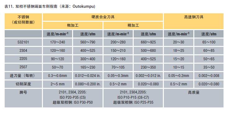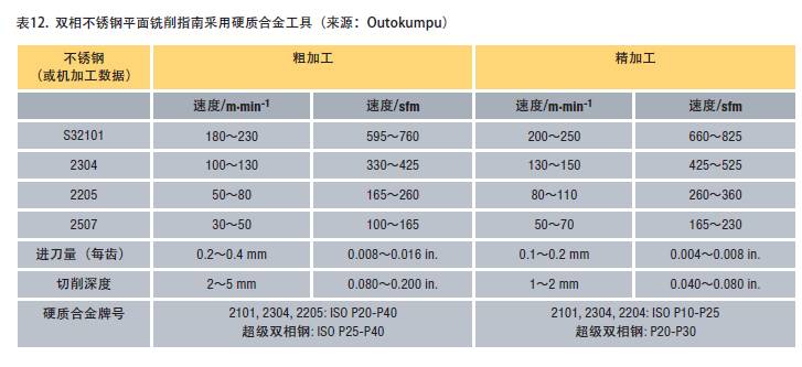 雙相不銹鋼采用硬質合金刀具進行平面銑削的指南見表12。