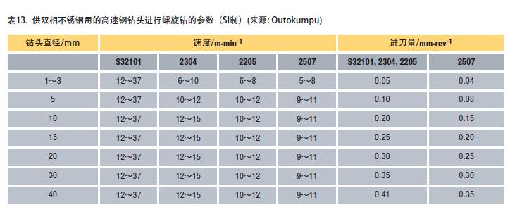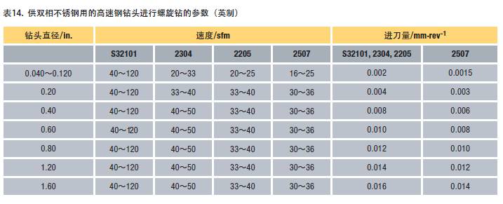 表13和14給出了用高速鋼鉆對雙相不銹鋼進行螺旋鉆的準則。
