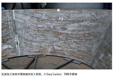 不銹鋼上的嵌入鐵或游離鐵,是由于用碳素鋼工具加工或運輸不銹鋼帶來的。如果用碳鋼工具處理不銹鋼,或在存放不銹鋼的地方附近加工碳鋼,則鐵會轉移到不銹鋼表面。隨后鐵在潮濕或濕潤的環境中生銹并可能引發不銹鋼表面的腐蝕。解決方法是避免不銹鋼與碳鋼的所有接觸。不銹鋼的加工應當僅使用不銹鋼工具,不銹鋼鋼絲刷,不銹鋼夾具和未沾污的新砂輪。在車間里經常用不同顏色為工具編號。