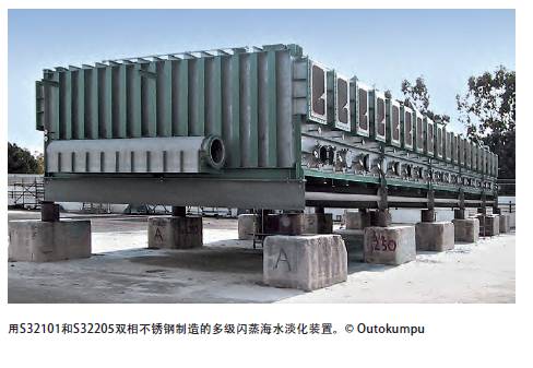 雙相不銹鋼用于海水淡化的下一個階段是2004年年初,兩種不同類型的雙相不銹鋼被用于蒸發器的結構——采用高耐腐蝕的2205制作在最惡劣條件下使用的部件,使用2304制作在不太惡劣條件下使用的部件。