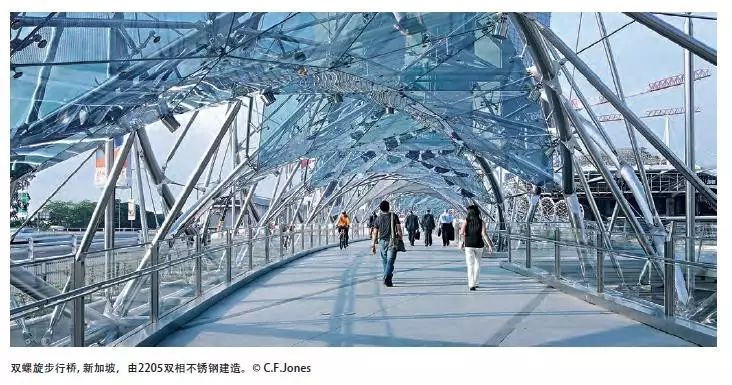 雙螺旋步行橋使用了570噸雙相不銹鋼。這座橋令人驚嘆的設計包含了類似于DNA結構的兩個螺旋形不銹鋼管,雙螺旋及其支撐結構分別使用2205雙相鋼管材和板材。不銹鋼表面通過反射燈光來提供晚間照明, 燈光被用來增強設計效果。