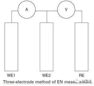 如果 ECN 作為兩個相同工作電極之間的電流被測量,這種工作電極組合的電位可通過測量與另一參比電極或第三工作電極之間的電位而得到。這樣可以通過計算電位標準差和電流標準差的比值而得到電化學噪聲電阻 Rn,Eden 等人提出了面積與電位標準偏差的乘積與電流標準偏差的商得到的參數,該參數具有電阻乘以面積的單位,被稱為電化學噪聲電阻,這是測量電化學噪聲的簡單方法。