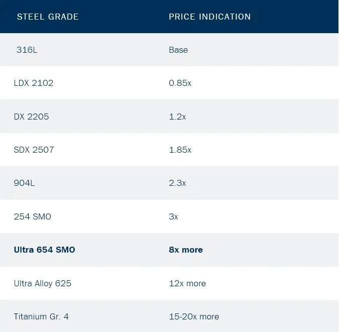 表2顯示,雖然Ultra 654SMO比316L(8倍)貴得多,但比鈦合金(316L的15至20倍)具有更高的成本效益。此外,如表1所示,與高合金鋼相比,Ultra 654SMO的鎳(Ni)和鉬(Mo)含量較低,因此價格穩定性更高。