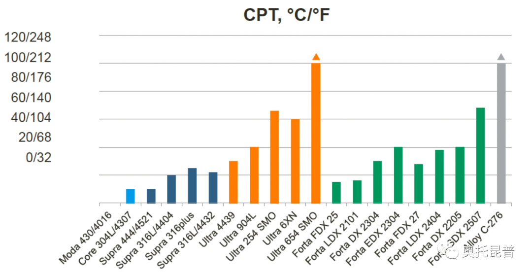 Ultra 654SMO在ASTM G48E測試下具有出色的抗點蝕性能,其臨界點蝕溫度CPT可以與C-276合金相媲美。