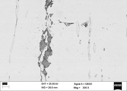 貴妃戲鹿圖——00Cr19Ni10鋼中氧化鋁夾雜經(jīng)鍛造變形后破碎后伴生裂紋(朱春維 中國航發(fā)貴州黎陽航空動力有限公司)