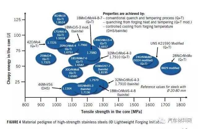鍛造和輕量化當人們想到鍛造時,輕量化并不是一個立刻浮現在腦海中的詞。然而,鍛造技術被證明是一種經濟有效的方法,可以在汽車應用中實現輕量化的設計進步,從而適合大批量生產。通過利用鍛造技術提供的潛力。在當前的“輕型鍛造計劃”研究項目中展示了在雙橋(splitaxle,分段式驅動橋)混合動力汽車(HybridElectric Vehicle,HEV)和重型卡車子系統中輕量化設計的潛力。項目和評估車輛(圖1顯示了項目詳細信息和技術車輛數據:研究項目共提出了733個混合動力汽車輕量化設計構思和251個卡車輕量化構思。)圖1輕量化設計潛力概述混合動力汽車:作為研究的一部分,考慮了混合動力汽車中總重量為816千克的零部件–大約相當于參考汽車的51%。分析了來自混合動力汽車的動力總成、底盤和電子設備的3600多個comCOVER組件,總共開發了733種輕量化設計思想。然后根據輕量級設計潛力、制造工作和市場實施工作的標準對這些想法進行權衡和分類。這樣就可以根據輕量化設計的成本效益比來評估相關的設計想法,如圖2所示。總的來說,該研究確定了混合動力汽車93千克的輕量化設計潛力,這相當于所分析部件質量的大約11%。然后,根據潛在的重量節省和實施努力,這些想法可以被分類為速效方案、平衡和較難實施的三類,具體取決于潛在的重量減輕和實施工作。圖2商用車:對于商用車動力總成而言,在設計基準測試期間共分析了460個組件,總重量為909kg。在該總重量中,290千克來自傳動裝置,而619千克來自傳動軸和后軸。基于技術可能性,開發了250多個輕型設計思想。最終的輕量化設計潛力總計達到124千克,大約是所分析組件質量的14%。這些想法可以歸類為通過材料、設計或生產概念實現的輕量化設計。但是,這些概念并不是完全獨立的,有時它們是相互依賴的圖3采用材料創新的輕量化設計現代的高強度鋼可以為減輕單個零件的重量,從而減輕車輛的總重量做出重要且具有成本效益的貢獻。倡議的鋼鐵制造商和鍛造公司提議使用大約20種不同的高強度鋼,以實現輕量化,更精簡的零部件設計。這些鋼具有廣泛的成分,金相組織和性能范圍。建議的一些沉淀硬化鐵素體-珠光體(彌散硬化鋼,DHS)和調質(Q+ T)高強度鋼,以及在鍛件冷卻后具有貝氏體組織的鋼在圖4的材料譜中顯示了這些材料的鍛造溫度、以及它們的強度和延展性。圖4Saarstahl,Sidenor和Georgsmarien-hütte建議連桿,曲軸和輪架使用高強度彌散硬化鋼,例如38MnVS6和46MnVS6,它們通過鍛造熱的冷卻控制而達到機械性能,而無需額外的熱處理工藝。在某些情況下,這種彌散硬化鋼的強度可能會超過傳統的調質鋼的強度,例如42CrMo4。圖5高強度貝氏體鋼有時會通過鍛造熱的受控冷卻獲得更高的強度,同時改善延展性。圖4顯示了幾種貝氏體鋼。在圖5提出了幾種用于具體應用的貝氏體。圖5中的百分比表示與輕量化設計方案相比,系列零件的重量增加了多少。鐵姆肯鋼公司(TimkenSteel)展示了具有較高強度的沖擊性能(夏比能量值)的鋼。在如此高的強度下,鋼的清潔度起著至關重要的作用。鐵姆肯鋼鐵公司表示,因此在生產過程中使用了其“超潔凈鈾”技術。彈簧鋼可實現最高的抗拉強度,例如55Cr3,Saarstahl建議的熱機械軋制54SiCrV6、60SiCrV7或ArcelorMittal展示的SolamM2050 S-Cor,強度可達2050MPa。這種鋼可以減輕諸如橫桿或彈簧之類的車輛部件的重量。通過使用高強度鋼實現的重量減輕不僅在鍛件的情況下是可能的。使用可以承受更高載荷的鍛鋼也可以替代鑄件。因此,德國DeutscheEdelstahlwerke建議使用不銹鋼,耐磨、高碳濃縮和氮合金鋼來代替重35.5千克的鑄造卡車制動盤。在此應用中,Sidenor在使用耐磨的錳合金鋼1.3401(X120Mn12)時發現了輕量化的設計潛力。在圖5(左上方)中,介紹了在分析的混合動力SUV中應用的差速器輸入軸的輕量化設計潛力。該空心軸目前由一種稱為SCr420H的CrMn滲碳鋼制成,重量為1182g。作為此類CrMn滲碳鋼的高強度替代品,Georgsmarienhütte與Hirschvogel合作開發了一種微合金化貝氏體鋼,稱為16MnCrV7-7(1.8195)。該鋼還可以進行表面硬化處理,并在高達1050°C的滲碳溫度下保持穩定的細晶粒結構。其特征還在于更高的淬透性值。這種用于差速器輸入軸的高強度鋼可實現優化的薄壁設計,從而有望減輕307g的重量。在該計劃中進行的分析還表明,對于管件(例如在減震器中組裝的管件),可以實現可觀的重量減輕。因此,本特勒建議用屈服強度為500-600兆帕的高強度鐵素體-貝氏體多相鋼FB590替換屈服強度至少為235MPa的E235+ CR鋼制成的管件。這樣,外管的壁厚可以從2.8毫米減小到2.0毫米,從而實現250g的相應輕量化減重(圖5左下)。安賽樂米塔爾(ArcelorMittal)建議使用鐵素體-珍珠巖鋼或其貝氏體鋼SolamB1100作為鑄造材料的輕質替代品,例如用于轉向節。通過在零件上進行的有限元模擬,可以估算出所減輕的重量。通過使用貝氏體鍛鋼,可以實現4100克重量的鑄件替換原先的5060克鑄件——只需通過鍛造熱控制冷卻,而無需進行昂貴的熱處理工藝。鋼鐵制造商Sidenor建議使用其Micro1100鋼(44MnSiVS6)來減輕圖5(右上方)所示轉向節的重量。通過直接從鍛造熱中冷卻鋼,生成了鐵素體-珠光體晶粒組織,其抗張強度為1100MPa。Sidenor認為這種輕量化設計潛力約為20%。連桿的輕型設計建議由ArcelorMittal,DeutscheEdelstahlwerke,Georgsmarienhütte,NipponSteel,Nis-san,Saarstahl,SchmiedetechnikPletten-be