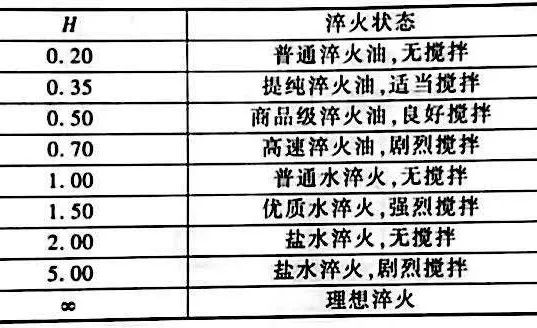 可以根據(jù)鋼的臨界直徑 DI 來測量鋼的淬透性,但該方法受熱量向外傳遞的速度影響,這與所用的淬火系統(tǒng)有關(guān)。為了建立統(tǒng)一的淬火參考標準,在淬透性測量方面,熱處理實踐普遍采用一種標準的冷卻介質(zhì)。這個標準通常稱為理想淬火,它使用的是一種假想的淬火冷卻介質(zhì),假設(shè)這種淬火冷卻介質(zhì)能夠把鋼的表面溫度冷卻到浴液的溫度并保持該溫度。理想淬火條件下鋼的臨界直徑稱為理想臨界直徑(記作DI 或者DI) 。典型淬火狀態(tài)的淬冷烈度(H) 見表 1 。