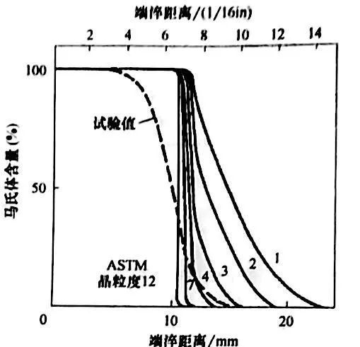 式中,x是1/16in的J位置,式(7 ) 采用英制單位(in) , 式(8 ) 采用國際公制單位(mm) 。式(4 ) 和式(7 ) [或者式(8 )]可以借助測量的末端淬火數(shù)據(jù)來估算實際生產(chǎn)中的硼系數(shù)。在ASTM A255-10中給出了具體的估算程序。