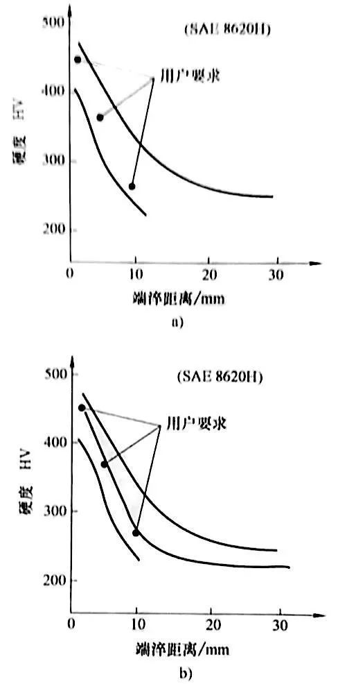 進行淬透性的量化預測時必須注意:即使末端淬火試驗程序和數(shù)據(jù)抽樣是依據(jù) ASTM 標準進行的,硬度和深度之間也有明顯的差距。如圖6所示,為相同晶粒度的SAE 8620鋼在不同實驗室得到的末端淬火淬透性結(jié)果。試驗設(shè)備、環(huán)境不同,以及把試樣轉(zhuǎn)移到試驗裝置上的操作者的效率不同,都會對數(shù)據(jù)的分散性造成影響。