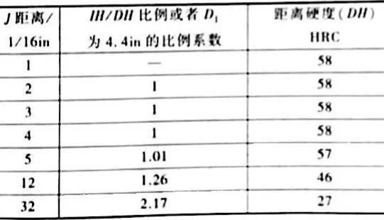 為了估算淬透性曲線,表11 中碳的質(zhì)量分數(shù)為0. 43%鋼,在J=1/16in (1. 6mm) 處的初始硬度(IH) 是58HRC (類似于8645鋼)。其他末端淬火部位的硬度(或者距離硬度 DH) 由IH除以 IH/DH或者表1-40 (in) 、表1-41 (mm) 中的硼鋼比例系