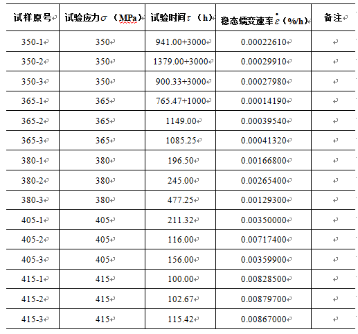 具體測定時,首先選定溫度,在同一溫度下選擇不同應力進行蠕變試驗,試驗進行至規定時間后停止。[1]試驗方案的設計主要是從材料的服役條件出發,確定溫度、時間、應力等試驗參數。