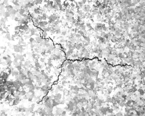熱裂紋是在鑄錠尚未完全凝固或雖已凝固而晶界和枝晶間尚有少量低熔點相時,因金屬液態、固態收縮及凝固收縮受到阻礙,當收縮應力超過了當時的金屬強度或線收縮大于合金延伸率時形成的。按出現的部位不同,熱裂紋可分為表面裂紋、中心裂紋、放射狀裂紋及側面橫裂紋等。熱裂紋多沿晶界擴展,曲折而不規則,常出現分枝,裂紋內可能夾有氧化膜或表面略帶氧化色。
