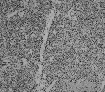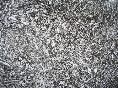同上,但滲碳體在鐵素體針內。過冷奧氏體在350℃~ms的轉變產物。其典型形態是雙凸透鏡狀含過飽和碳的鐵素體,并在其內分布著單方向排列的碳化物小薄片;在晶內呈針狀,針葉不交叉,但可交接。與回火馬氏體不同,馬氏體有層次之分,下貝氏體則顏色一致,下貝氏體的碳化物質點比回火馬氏體粗,易受侵蝕變黑,回火馬氏體顏色較淺,不易受侵蝕。高碳高合金鋼的碳化物分散度比低碳低合金鋼高,針葉比低碳低合金鋼細。