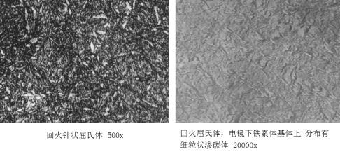 馬氏體分解得到極細的過渡型碳化物與過飽和(含碳較低)的a-相混合組織 它由馬氏體在150~250℃時回火形成。這種組織極易受腐蝕,光學顯微鏡下呈暗黑色針狀組織(保持淬火馬氏體位向),與下貝氏體很相似,只有在高倍電子顯微鏡下才能看到極細小的碳化物質點。