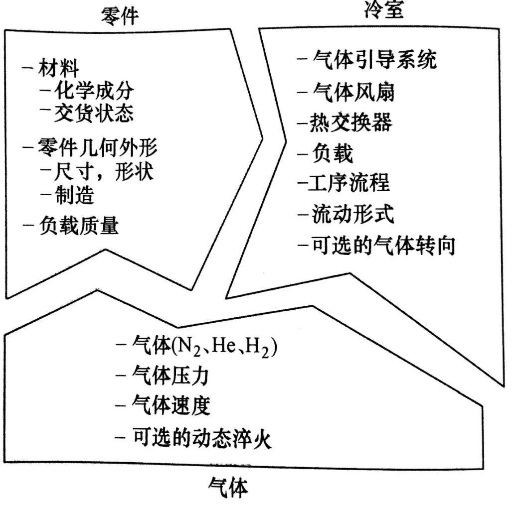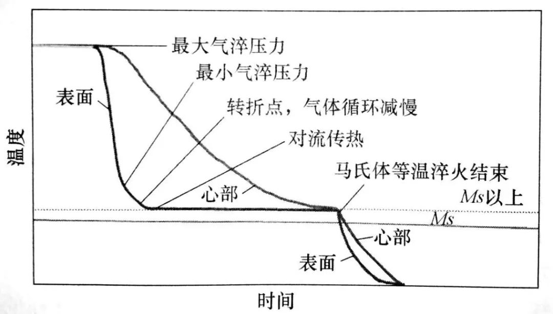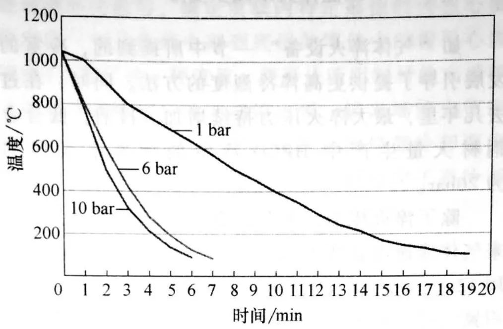 氣體淬火過程通常在高壓下實現,因此經常被稱為高壓氣體淬火(HPGQ) 。在HPGQ中,已經奧氏體或經化學熱處理的工件在惰性氣流中進行淬火,壓力為1~20bar,流速為0.5~20m/s。當采用噴管時,速度更高,可以達到80~160m/s。在少數情況下,采用高達25bar的壓力。在大部分情況下,HPGQ與真空熱處理相結合,如低壓滲碳(LPC ) ;在少數應用中,HPGQ 則被用于常規氣體滲碳之后。HPGQ之后通常緊跟著回火。