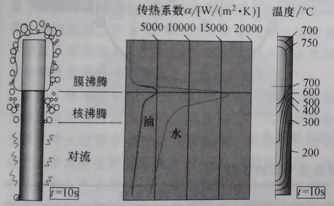 在HPGQ 工藝過程中,傳熱系數幾乎保持恒定。當對氣淬和液淬(油、水、聚合物溶液)的傳熱機制進行比較時,可以看出一個基本的差異。液淬中有三種不同的傳熱機制:膜沸騰、核沸騰和對流。這三種傳熱機制導致零件表面局部傳熱系數的分布很不均一(圖3 ) 。
