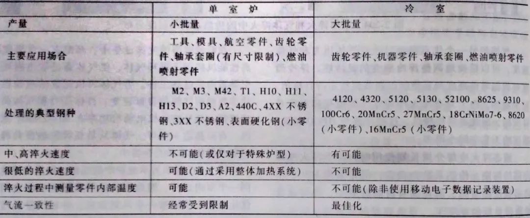 表1 所列為單室爐和冷室的優缺點以及典型應用。對于這兩類設備,為了滿足零件的硬度和變形均勻性的要求,提供均勻的氣體流速都是很重要的。