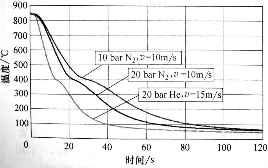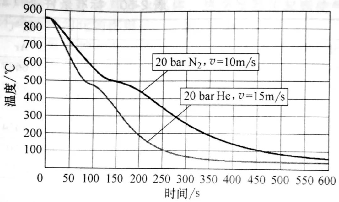 氮氣在工業上應用廣泛。氦氣應用于一需要更高淬火冷卻速度的場合,因為氦氣比氮氣更輕,安裝一個更大的葉輪就可以提供更高的氣流速而不用增加風機功率。然而,氦氣的成本較高,每次淬火周期后需對其進行重復利用,氬氣通常用于航空件的淬火。