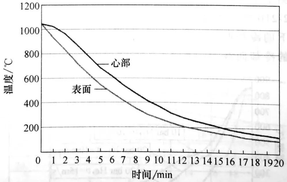 圖中顯示了當氣體流速在某一時刻減小至零時,不同尺寸零件的表面和心部的溫度。對于大試樣,氣體流速為零后其表面溫度會上升,原因是心部的熱量將表面重新加熱了。為了防止這種重新加熱,氣體流速不應減小至零,而應減小至一個防止再升溫的水平。