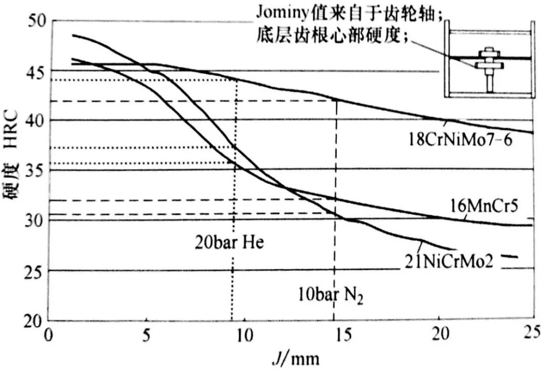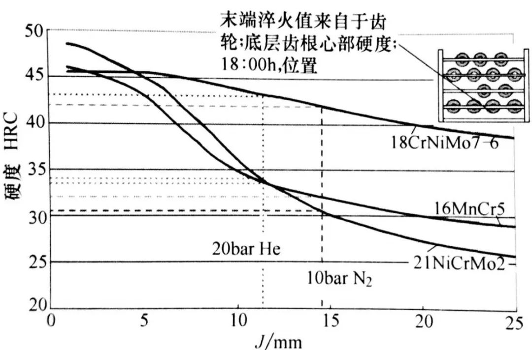 圖中展示了分別用20bar氦氣和10bar 氦氣淬火時,底層的末端淬火值。此外,圖中還加入了16MnCr5、21NiCrMo2 和 18CrNiMo7-6 鋼的末端淬火曲線。給出了典型的HH級鋼的淬透性曲線。從而可預測使用這些鋼種時齒根心部的硬度值。