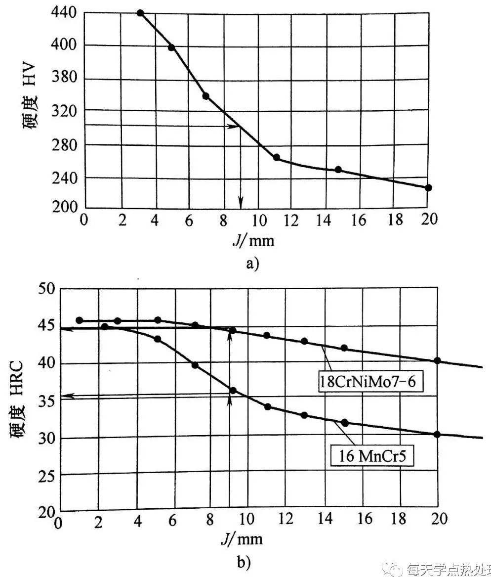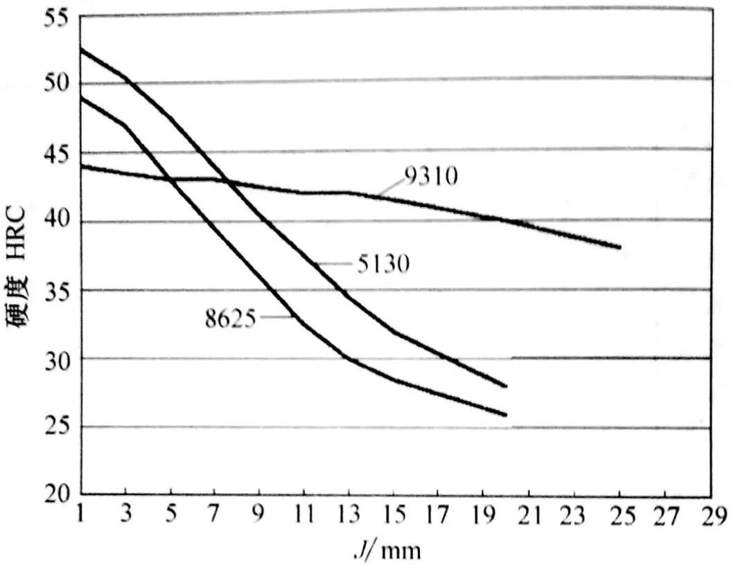 確定零件的局部末端淬火值后,便可預測選擇不同鋼種時所能獲得的齒根硬度值。如果已知鋼種的末端淬火曲線,則可從末端淬火曲線上讀取所能獲得的硬度值。