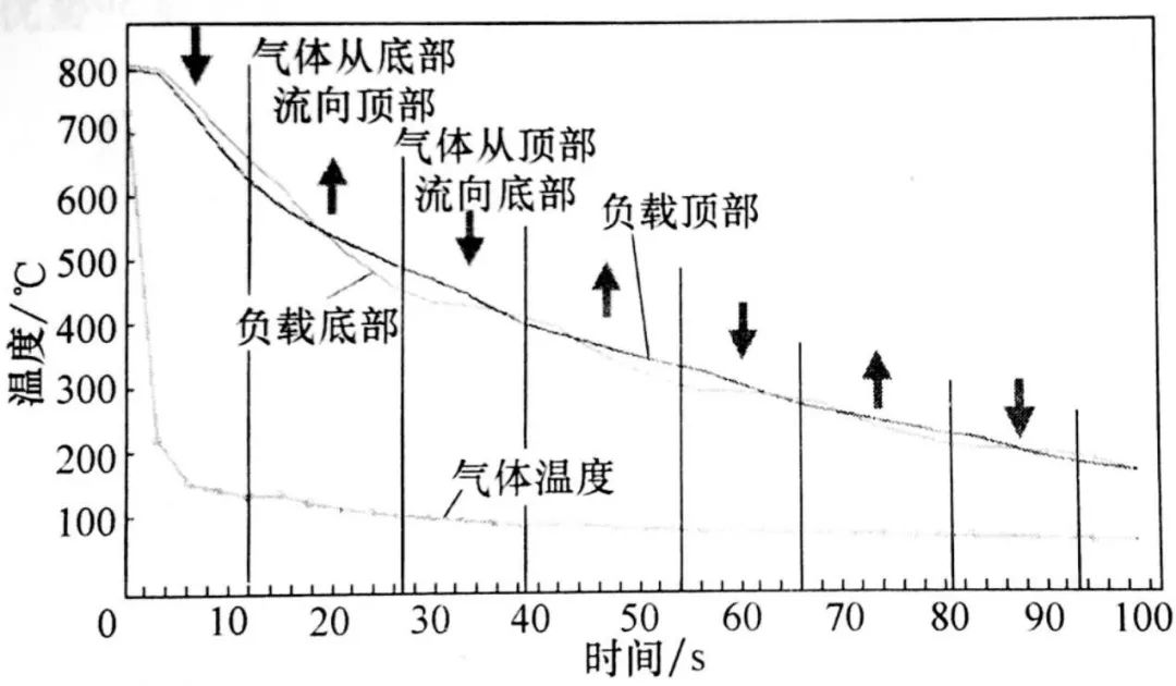圖16 所示為采用氣流轉向技術的淬火室示意圖。為了達到交替轉變氣流方向的目的,淬火室內配有氣動式翻板。氣流方向是從頂部到底部還是從底部到頂部,取決于閥門的設置。氣流方向的交替轉變是按時間來控制的。