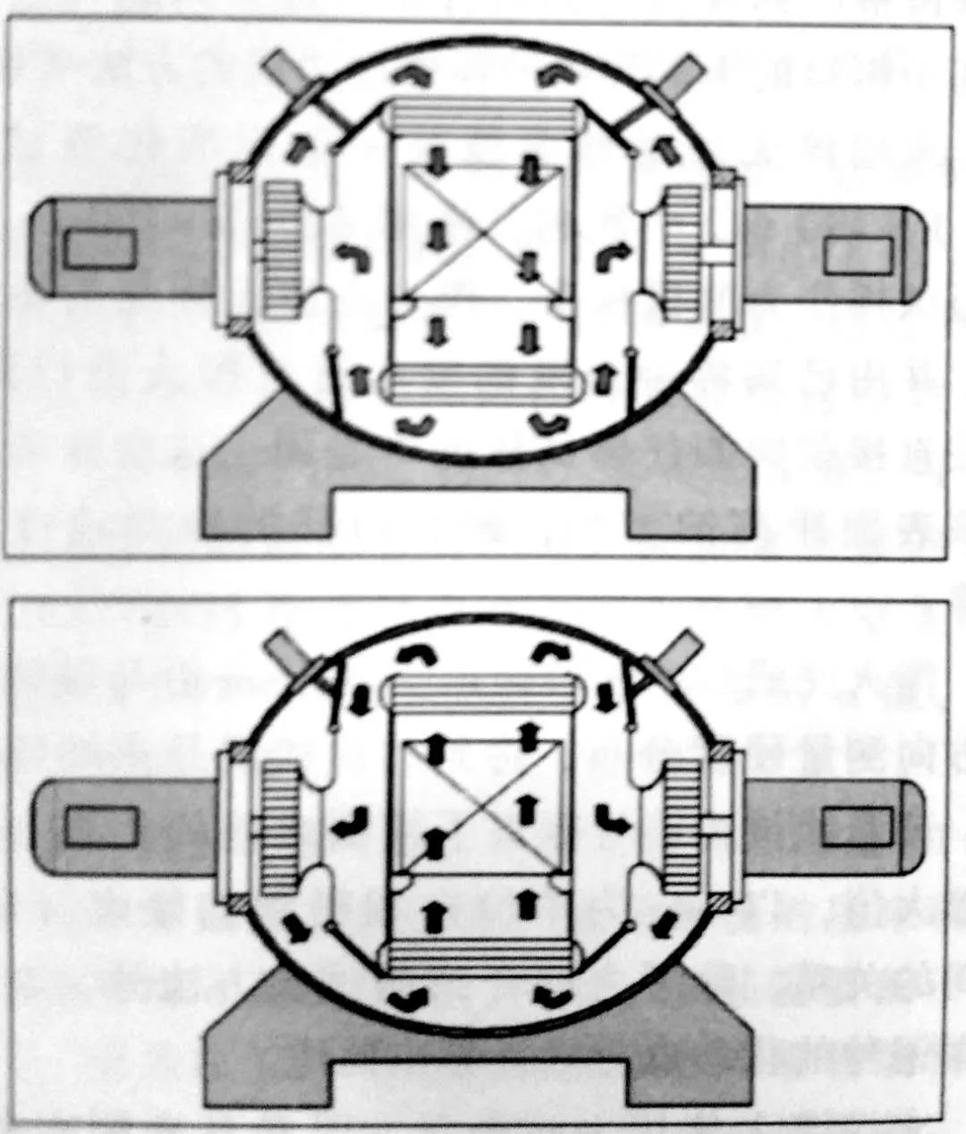 圖4 所示為單室爐中的氣流。加熱和淬火在同一個室內進行,因此室的設計是兩種功能之間的優化折中。氣體被一個風機加速,并被引導經過負載和熱交換器。通過改變翻板和導流板的位置,可以改變氣流的方向。單室爐的設計是可變的,如方形室或圓形室、用氣體噴嘴淬火及單向、雙向或四向定向冷室。