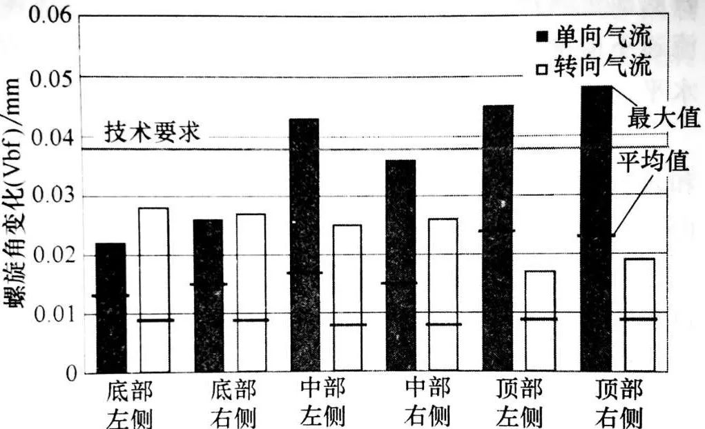 注:單向和轉向氣流的比較,最終傳動小齒輪在熱處理后上部、中部、下部的螺旋角變化;熱處理后最大值為38um。