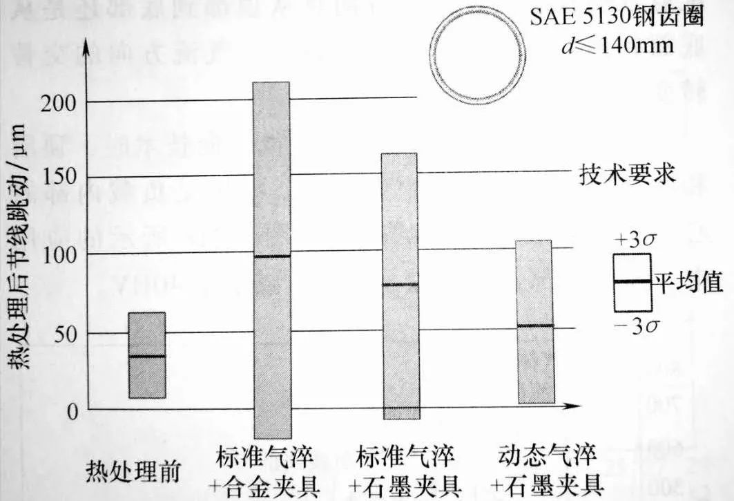 在另一個由5130M鋼制造的內齒圈的應用中,熱處理過程中的平均跳動量減少至7μm, 通過采用動態淬火,最大跳動量減少至41μm 。