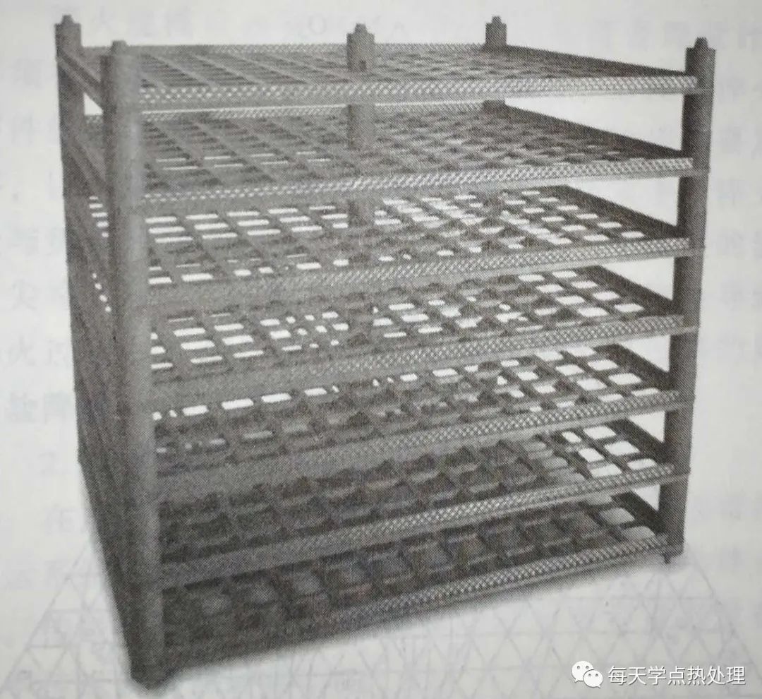 有兩類夾具材料可用于 HPGQ : 高鎳合金和CFC 材料。高鎳合金如 DIN 1.4818也可用于油淬。CFC 材料是由嵌合了纖維的碳基材料制成的,其中含有體積分數為50%~60%的纖維。CFC是耐熱材料,在采用保護氣體或真空時,其使用溫度高達2000℃ 。CFC的強度甚至會隨著溫度升高而增加。與室溫相比,1000℃時的熱彎曲強度增加了 15% 。CFC制成的夾具具有輕型化的特點,且在高溫下使用時不會發生蠕變。與由合金制成的夾具不同, 即使在使用多年后,家具也不會發生彎曲或破裂。當在CFC夾具上處理零件時,保證了夾具中所有零件都能被水平裝夾,這使得在很多應用中零件變形有所減少。與鋼材的密度7900kg/m3相比,CFC的密度只有(1400~1650) kg/m3, 這也是CFC夾具比合金夾具更輕并能更快地被加熱的原因。然而,由于CFC的比熱容[1~2kJ/ (kg·K) ] 比鋼材[0. 5kJ/(kg·K) ] 的高,在一定程度上削減了CFC的這一優勢。典型的CFC夾具如圖23 所示。