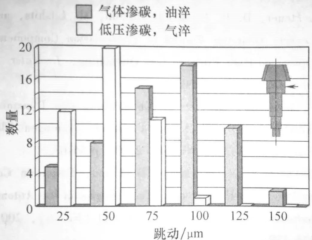 由于氣體介質沒有相變,與液體淬火介質相比,HPGQ在很多應用中可減少變形。有許多場合,導致生產問題的并不是變形的絕對大小,而是變形的散差。當變形散差程度低時,可在軟加工中進行預補償,所以對于很多場合來說,難點在于通過熱處理過程,使其負載內部和隨著時間推移負載與負載之間的變形散差很小,來優化HPGQ 。很多應用已經證明,HPGQ造成的變形散差顯著減少。圖24 所示為 LPC+HPGQ 之后以及氣體滲碳+油淬之后,斜齒輪徑向跳動的對比。斜齒輪由 ASTM 8625鋼制造,高280mm, 頭部直徑為85mm 。通過采用氣流轉向和動態氣淬工藝可實現變形的進一步減小。