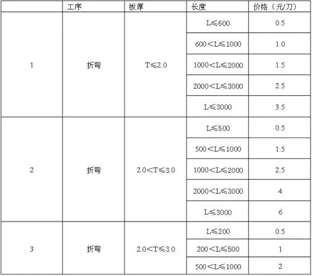 以合理的價格獲取客戶訂單,以營利的目的使公司持續(xù)經營和發(fā)展。 2.1 本標準適用所有客戶詢價的結構件需求產品,這些產品包含但不限于:各客戶的零件,機箱,機柜等以鈑金加工為主的產品和零部件。 2.2 此基準只作為一個報價參考標準,當報給客戶的價格低于成本價時,需經總經理簽字方可生效。 外購件費:公司從供應商處直接購買的產品和零部件,如機加工件,標準件,非金屬件,標簽等所產生的采購費用。在計算時要注意加上5%-15%的代理費用。 表處費:由公司或者委托外協(xié)廠對產品或零件部件進行噴粉,噴漆,電鍍,氧化等表面處理所產生的費用。在計算面積時,需按雙面計算,并乘以10%-20%的損耗。 材料費:實現(xiàn)產品所必須購買的板材費用,其計算方法為:在展開尺寸長寬方向+20,再加上20%的材料損耗(材料費=(長+20)*(寬+20)*厚*1.2*比重/1000000*材質單價);對于量大而且可定制專用料生產的零件可適當調整材料損耗;對于尺寸大于600*600的工件需要根據(jù)實際的排版或材料利用情況去計算材料費用。 加工費:在實現(xiàn)產品過程中每到工序所產生的生產費用,如數(shù)控加工費,激光加工費,剪床費用,刻字費用,鉗工費用,貼膜費用,校平費用,沖壓費用,焊接打磨費用,折彎費用,組裝費用等。 附加費用:包含但不限于模具費,菲林網板費,工裝夾治具費,特殊檢測費等。需在報價時單獨列出,由業(yè)務與客戶協(xié)商,把相關費用分攤到產品中,或由客戶單獨提供。 零件損耗:在產品加工過程中所產生的不可避免的產品報廢相對于整批產品的百分比,一般情況下3%-5%,視加工工藝難度而定。 包裝運輸費:產品在運送到客戶過程中所產生的包裝費用和運輸費用,由市場部根據(jù)客戶實際需求而定。 含稅單價:(由材料費+加工費+表處費+外購件費)*損耗+包裝運輸費+管理費+利潤構成。 注意批量含稅價一般是指不含模具費等附加費用的價格,如果需要模具費等附加費用,要求在備注欄注明批量模具價格及分攤數(shù)量。產品含稅單價=(材料費+加工費+表面處理費+外構件費)*損耗+包裝運輸費+工程費+利潤。 ★正常情況我們以不低于成本費用的1.3倍向客戶提供產品報價(加工費和表面處理費的1.3倍),系數(shù)可綜合客戶各方面因素(如數(shù)量,加工難度等)進行調整,最終價格不得低于成本價格; ★定價之前需充分理解客戶的產品,客戶的需求,必要時可從競爭對手中掌握一些客戶的資料,從而進行標準定價,原則上報給客戶的價格客戶調價額度不能高于產品報價的10%,高于此額度時,需征得總經理批準。 ★公司具有競爭優(yōu)勢的產品,在報價時一定要盡可能多的獲取利潤,在價格上我們決不能夠輕易讓步。5.0 各工序加工成本費用(含17%的稅率) 僅供參考!a:鋁板激光下料的加工費按不銹鋼板的1.2倍計 算; c: 圓孔直徑大于等于10倍板厚時,不算穿孔費,但以周長計算; 激光下料機選公式: 激光下料費用=周長(包含外形周長和內側大孔周長)*每米單價+孔數(shù)*穿孔費5.2.1村田數(shù)控沖床加工費用平均每小時240元/小時,按加工件的周長總數(shù)來計算,外形切邊加工費0.0022元/mm,每孔的加工費為0.03元/孔,網孔按0.015元/孔(周長大于孔位按外切形計算,異形孔按實際拼刀次數(shù)來計算。 5.2.2 適用加工板厚范圍:碳鋼/鋁板/銅板厚度0.5≦T≦2.5,不銹鋼板厚度為0.5≦T≦1.2。 5.2.3 所有不銹鋼板和厚度為2.5的碳鋼/鋁板/銅板在數(shù)控上加工時,均需乘以1.5倍的系數(shù)。 5.2.4 此價格包含取毛刺費,但取銳邊倒鈍需另外按打磨費用增加。 100T以下(含100T)折床按100元/小時來計算,100T以上折床按150元/小時計算。a. 所有需墊膜折彎的產品,需在此基礎上乘以1.2倍的參數(shù); b. 8mm的碳鋼板折彎費用,按6mm的1.5倍計算; c. 當單個零件的重量大于30KG小于50KG時,需乘以1.2倍系數(shù);大于50KG小于80KG時,乘以1.5倍系數(shù);大于80KG時,需乘以2倍的系數(shù)。 d. 同一個零件中折邊有長邊和短邊時,折彎費用全部按長邊算。 a:當工件單面面積大于0.25平方米,小于1平方米時每孔加工費需乘以1.5倍系數(shù)。 b:當工件單面面積大于1平方米時,每孔加工費需乘以2倍系數(shù)。 c:超出上表范圍內的攻牙和沉孔費用,需按實際情況收取。 5.5.2 60-100噸沖床按每沖0.2元計算; 焊接費用包含打磨費。對于焊接報價需要根據(jù)工件的大小,復雜程度,外觀要求,是否可用機器人焊機等因素來綜合進行報價,可在實際加工時間上乘以一定難度系數(shù)來定價。 5.8 數(shù)控剪床費用按60元/每小時計算;5.9.4 對于需防烤的零件或螺紋較多的零件需在原基礎上加10~20%的防烤費用;對于表面外觀質量要求高的產品,需適當?shù)某艘?~3倍的系數(shù);對于體積大于600*600*600或者重量大于60KG的零件,需按實際加工難度情況加上20~200%的難度系數(shù)。 如不超過A4紙大小的按1.2/次計算,如超過A4紙大的按2.5/次計算,同一零件多種顏色的絲印需乘以20~50%的難度系數(shù)。