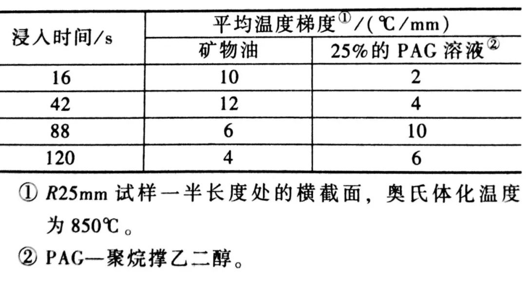 這些數據清楚地顯示了這兩種淬火過程之間傳熱動力學的明顯差異。油淬的特點是從一開始就迅速冷卻,而 PAG 溶液淬火的特點是吸熱過程中長時間的相對緩慢冷卻,以及隨后在聚合物膜破裂后出現的溫度驟然升高。這反映了冷卻速度顯著的不連續改變,對淬火中鋼制品行為轉變的有特定的影響。