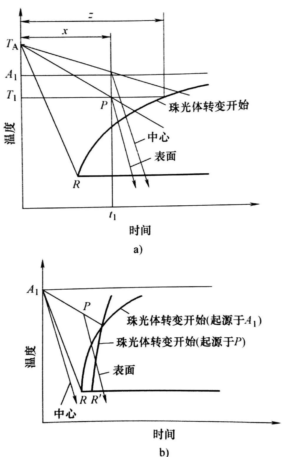 參見預冷淬火原理圖如圖4 a)。z 是在任意一條等溫線上給定的總孕育時間,是直至轉變開始的時間,而 x 是冷卻速度不連續變化前的孕育時間。