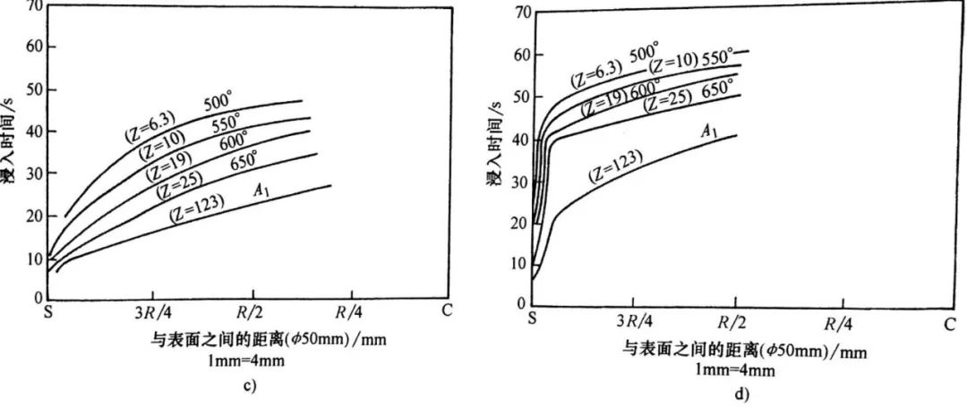 在點P以下進一步冷卻,將出現一個大幅升高的冷卻速度轉變開始,曲線發生改變,如圖4 b)所示。因為中心部位沒有消耗孕育時間,中心部位的冷卻曲線起始于A1 溫度處(時間為0 ) 。此時中心部位的冷卻曲線橫穿了珠光體相區以下的區域,結果是中心部位得到了區域的組織,所以硬度高于表面的硬度。