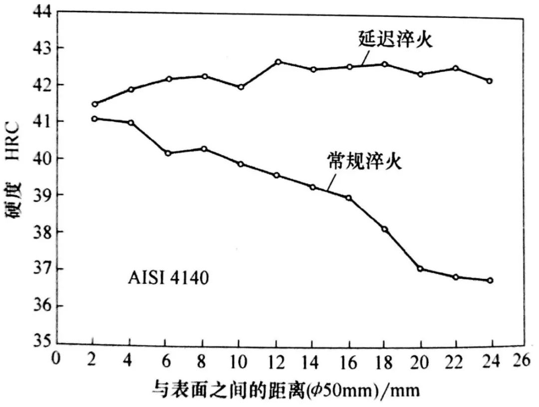 逆淬火導致心部硬度高于表面硬度,工件表面傳熱的預期改變,導致放熱主要來自心部。淬硬深度的增加取決于鋼材的淬透性和橫截面尺寸。這就可以通過控制傳熱,來影響硬度分布,從而影響性能。