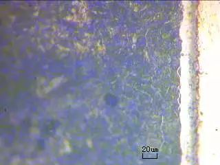 (2)檢測零件氮碳共滲鹽浴復(fù)合處理后的硬度,首先測試表面硬度,三個(gè)硬度值分別為896.51HV0.1、918.93HV0.1、907.59HV0.1,平均硬度值為907.68HV0.1。對斷面用4%的硝酸酒精溶液腐蝕,金相顯微鏡400×下觀察可知化合物深度為20μm左右,見圖1,檢測斷面梯度硬度,整個(gè)硬化層大約為0.5mm,見圖2。
