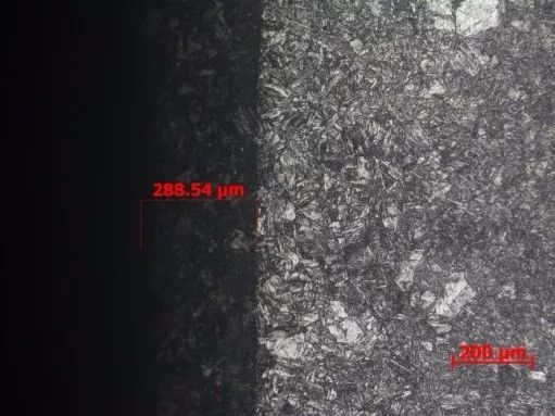 采用金相法測定氮化層的深度,金相法是利用氮化層組織與心部組織抗腐蝕性能不同的特點來測定氮化層深度,氮化試樣采用5%CuSO4溶液浸蝕,用金相顯微鏡測量氮化層深度。維氏硬度計檢驗氮化層表面硬度,顯微維氏硬度計測量氮化層不同位置的硬度。