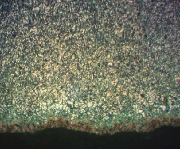 經對裂紋件取樣進行金相分析,裂紋兩側無氧化脫碳,硬化層深HV550:1.20mm,碳化物2級,馬氏體及殘留奧氏體8級(見圖2),表層出現較多的白色組織,回火不充分,將試樣重新回火后C2、A’M4。